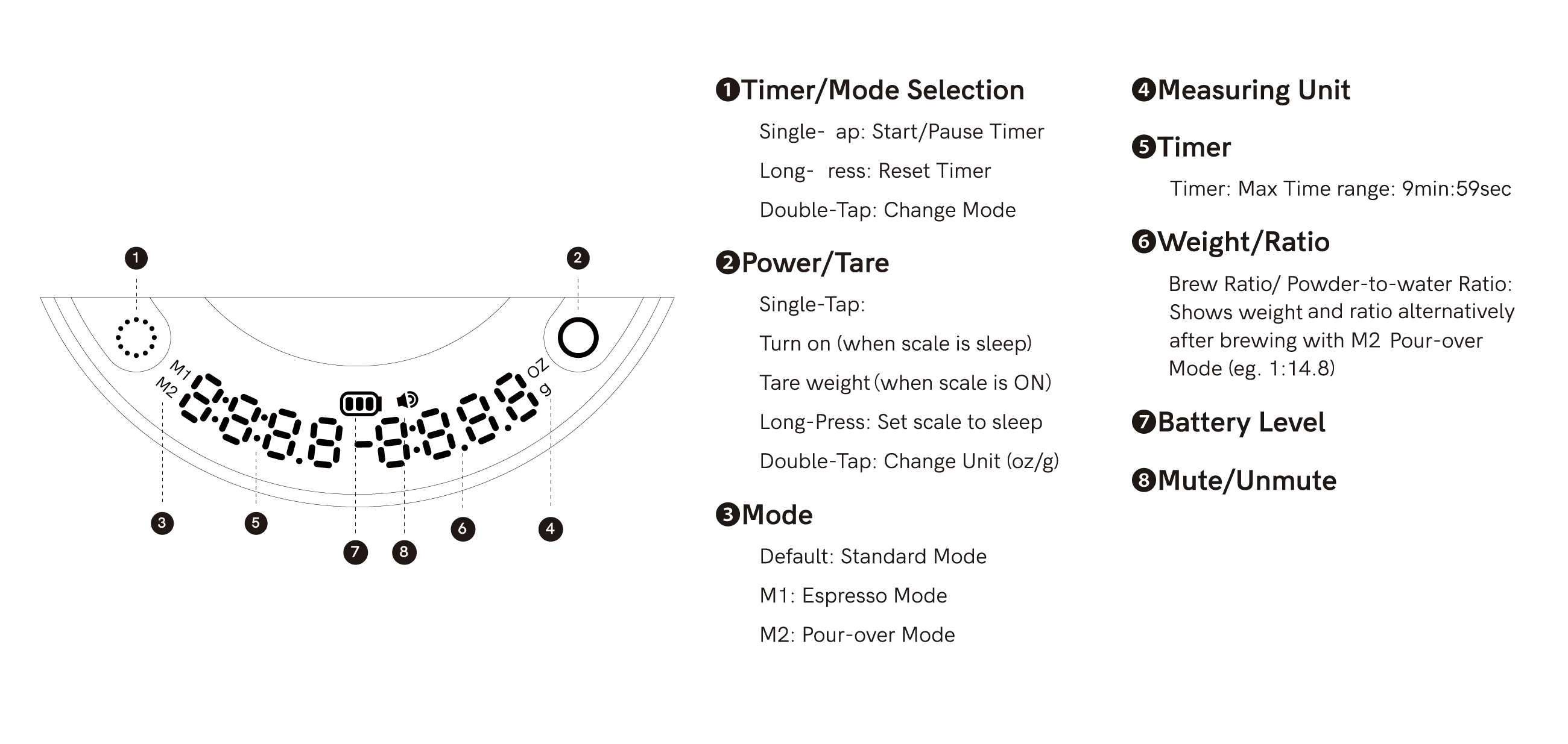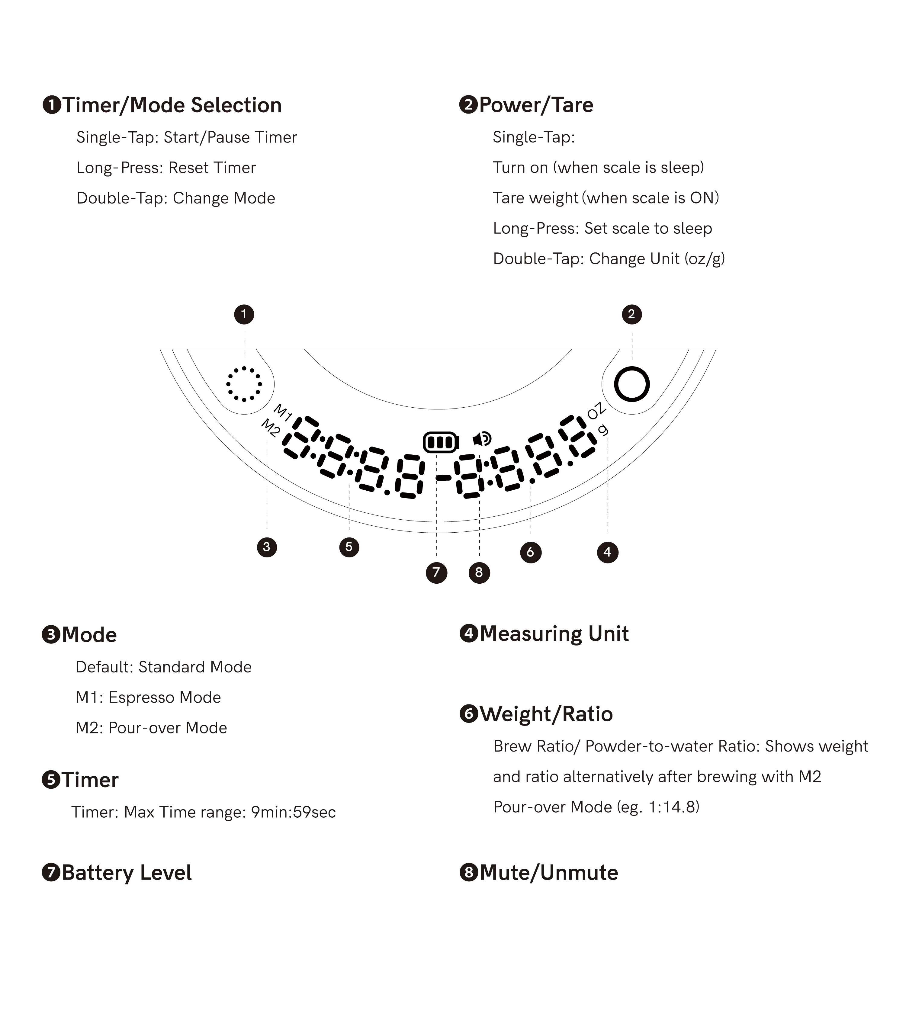 6. When you finish brewing and removing the set from scale,the timer will pause automatically. Display will show total brewing time, weight/Powder-to-Water Ratio alternatively for 2 minutes before shutting off.