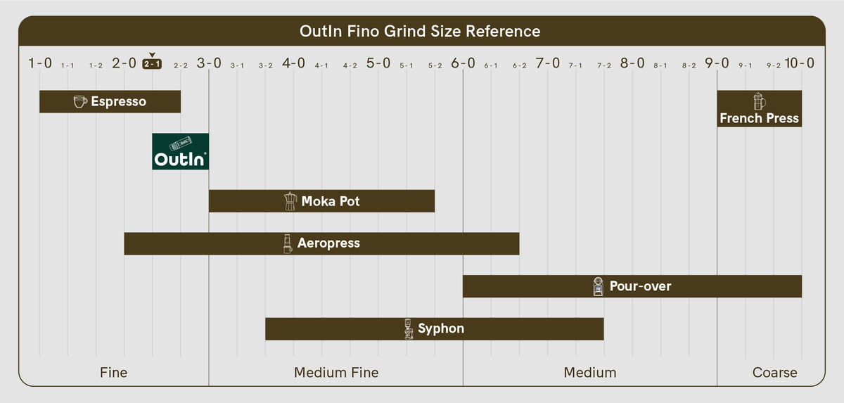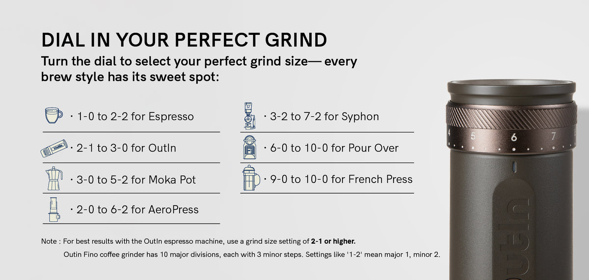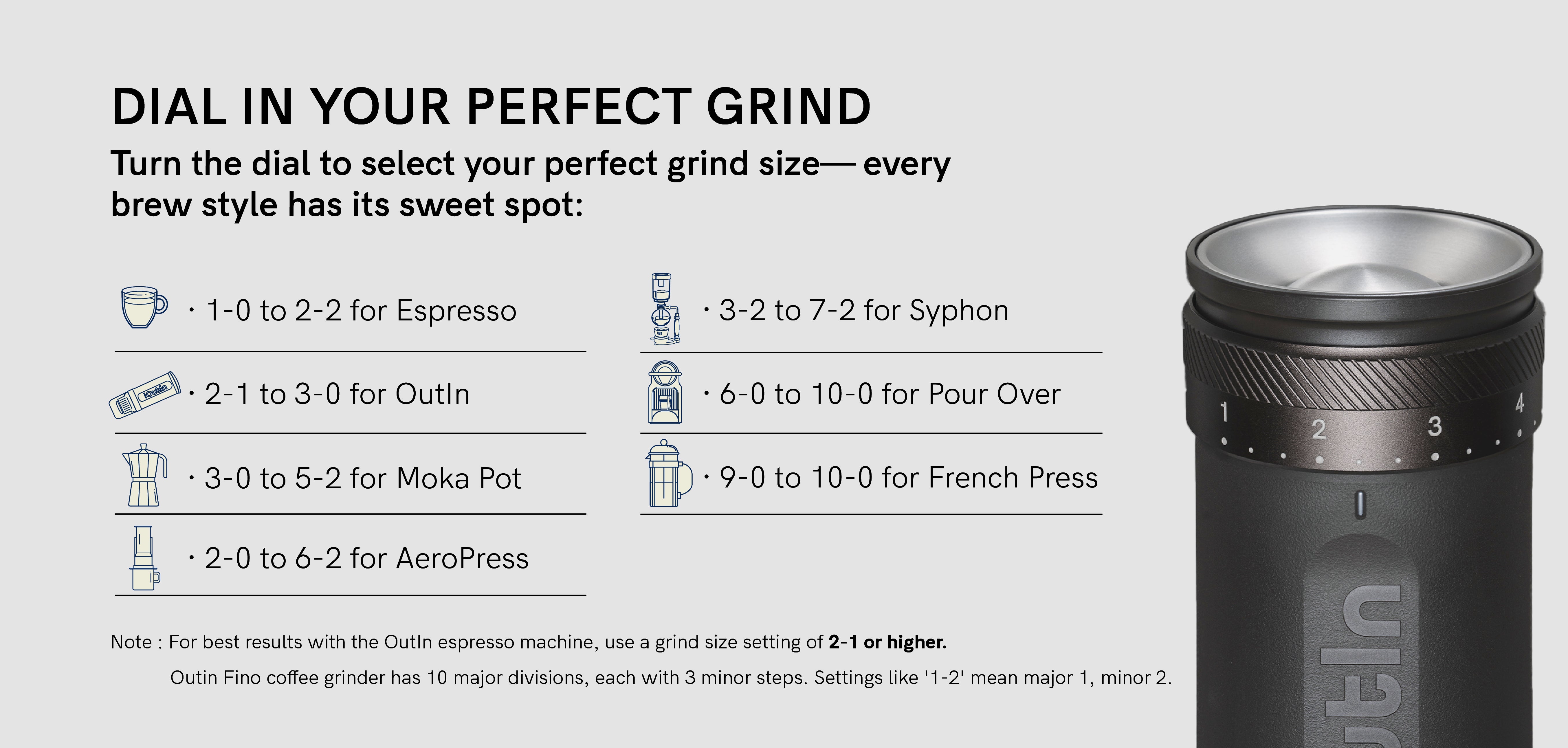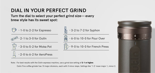 *For optimal performance with OutIn Nano or Mino, the Fino grinder requires a grind size setting of 2-1 or higher. This ensures proper extraction and flavor profile for your coffee.