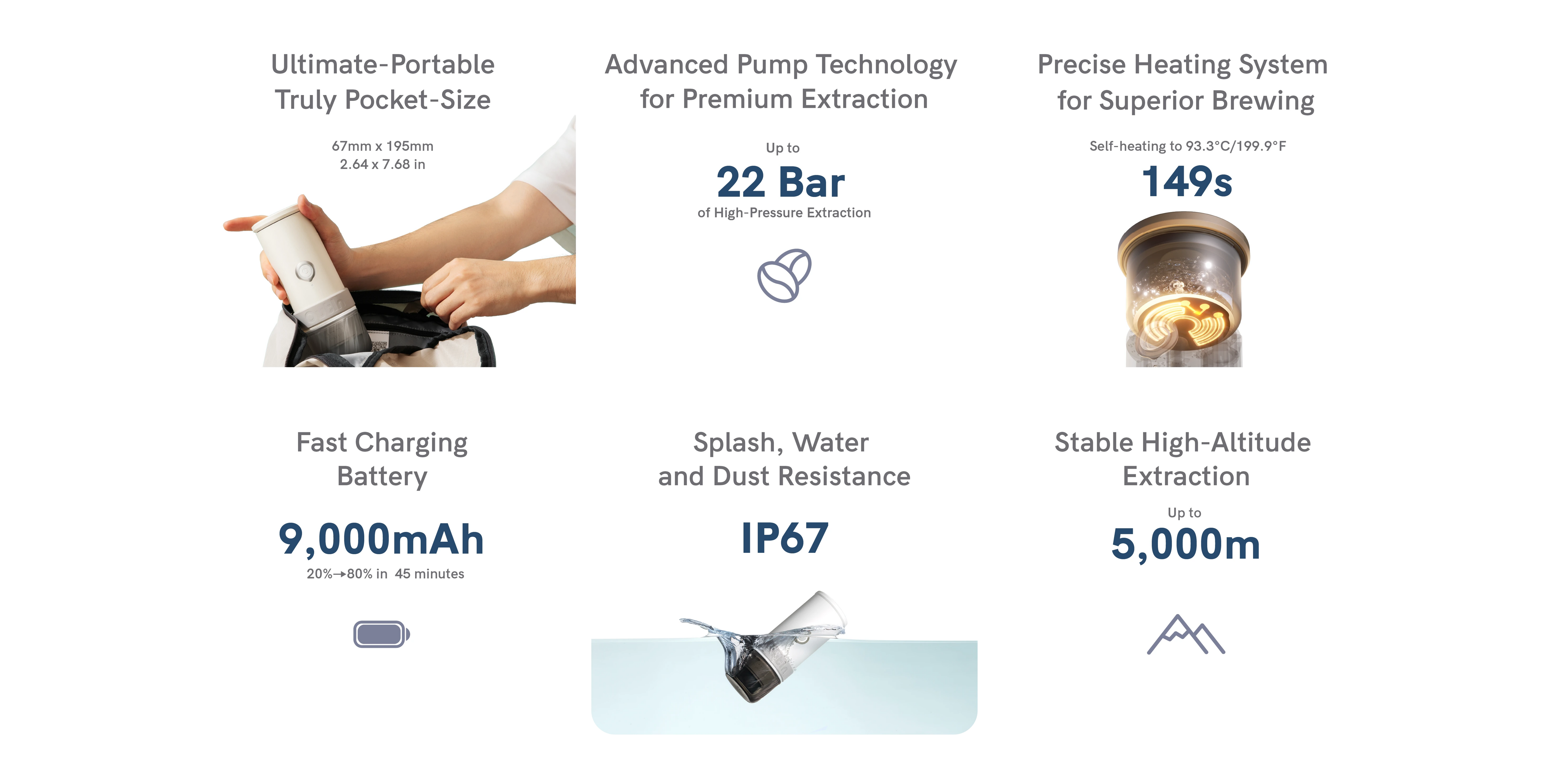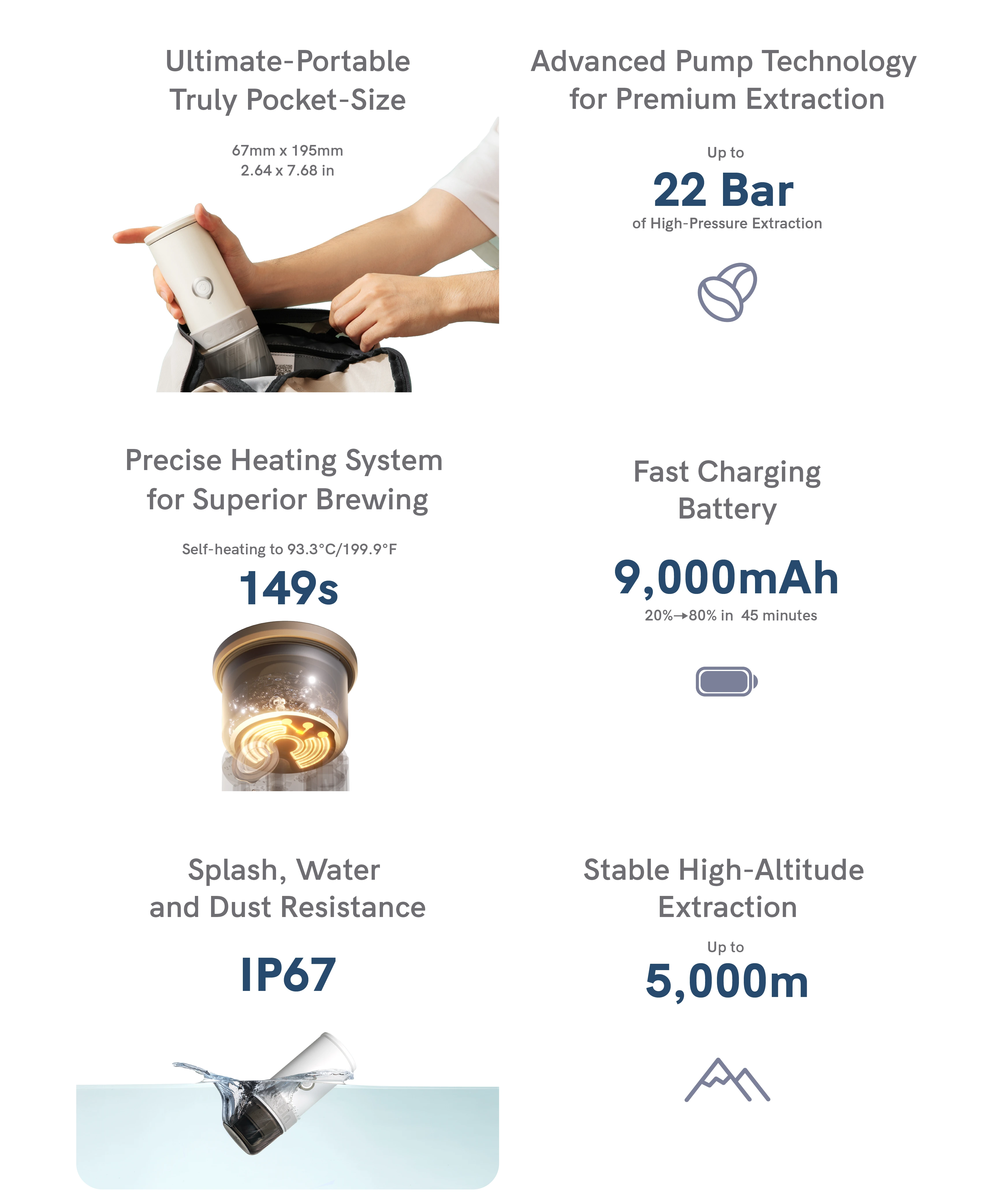 Ultimate-Portable, Truly Pocket-Size: Compact at φ67mm x 195mm, this electric espresso machine slips into your backpack or jacket pocket—perfect for hiking, camping, or any adventure.