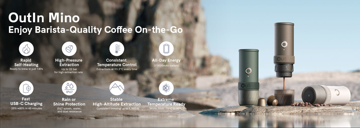 On the other hand, OutIn Mino is built for the wild at heart. From deserts to mountain peaks to deep jungles, it's your adventure-proof portable café. Equipped with 22 bar of pressure, and a specially engineered pump, the Mino delivers barista-level coffee extraction without any additional accessories. Right out of the box, Mino is ready to embark on new adventures with you. We believe in less is more.