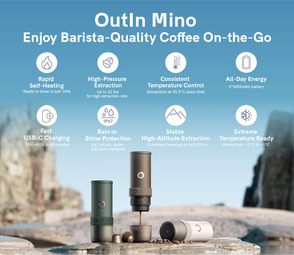 OutIn Mino's pump isn't just the finest portable coffee pump we've ever created — it's a promise. Wherever life takes you, it ensures your next cup can be your best. That's the power of redefining what a portable pump can be. That's OutIn.