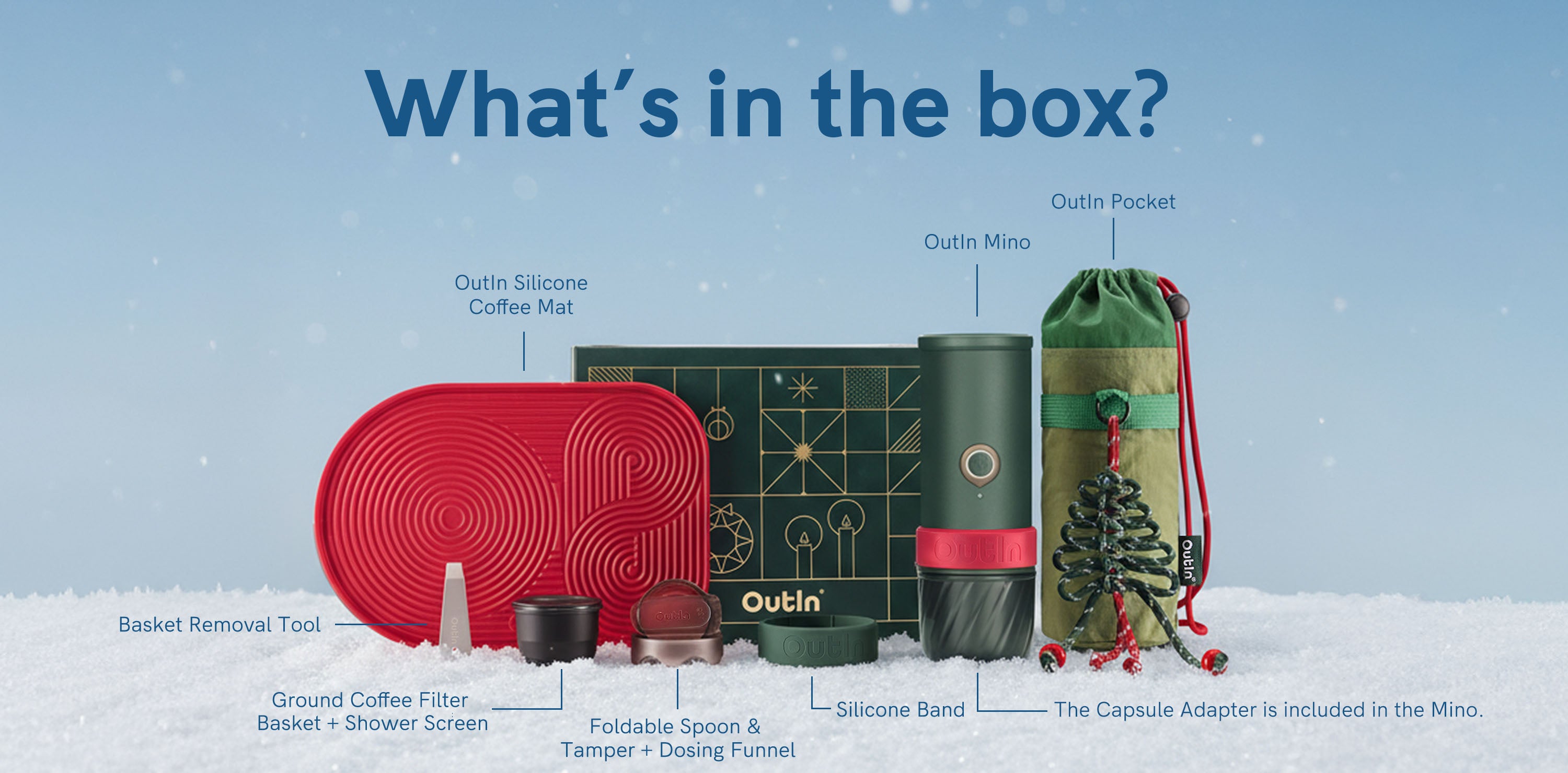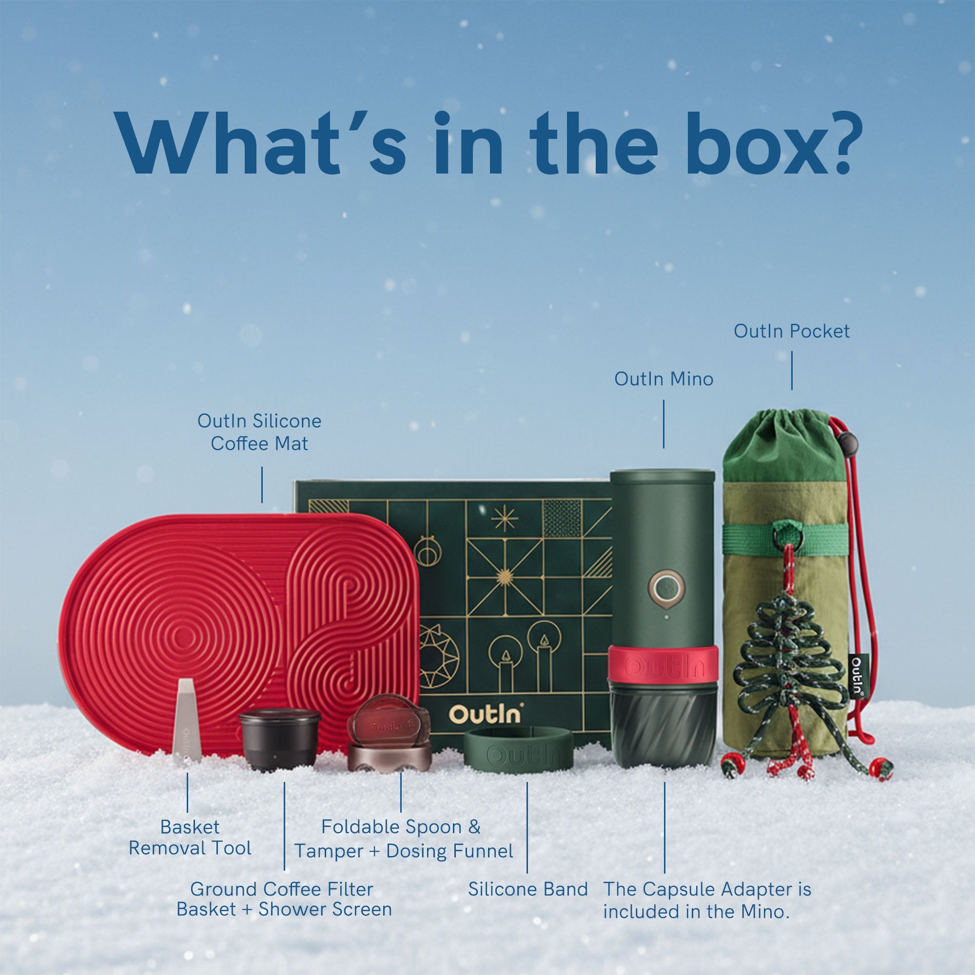 - Package Includes: OutIn Mino, Carry Pouch, Silicone Coffee Mat, and all necessary accessories